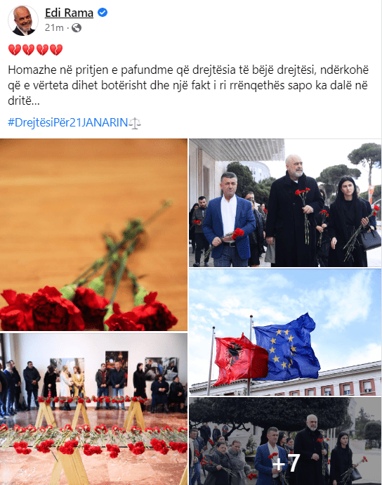 Kryeministri Edi Rama ka ndarë disa foto nga homazhet e kryera ditën e sotme për protestën e 21 janarit, ku mbetën të vrarë katër persona. Ai i ka konsideruar homazhet në Bulevardin Dëshmorët e Kombit në pritje që drejtësia të bëjë drejtësi.