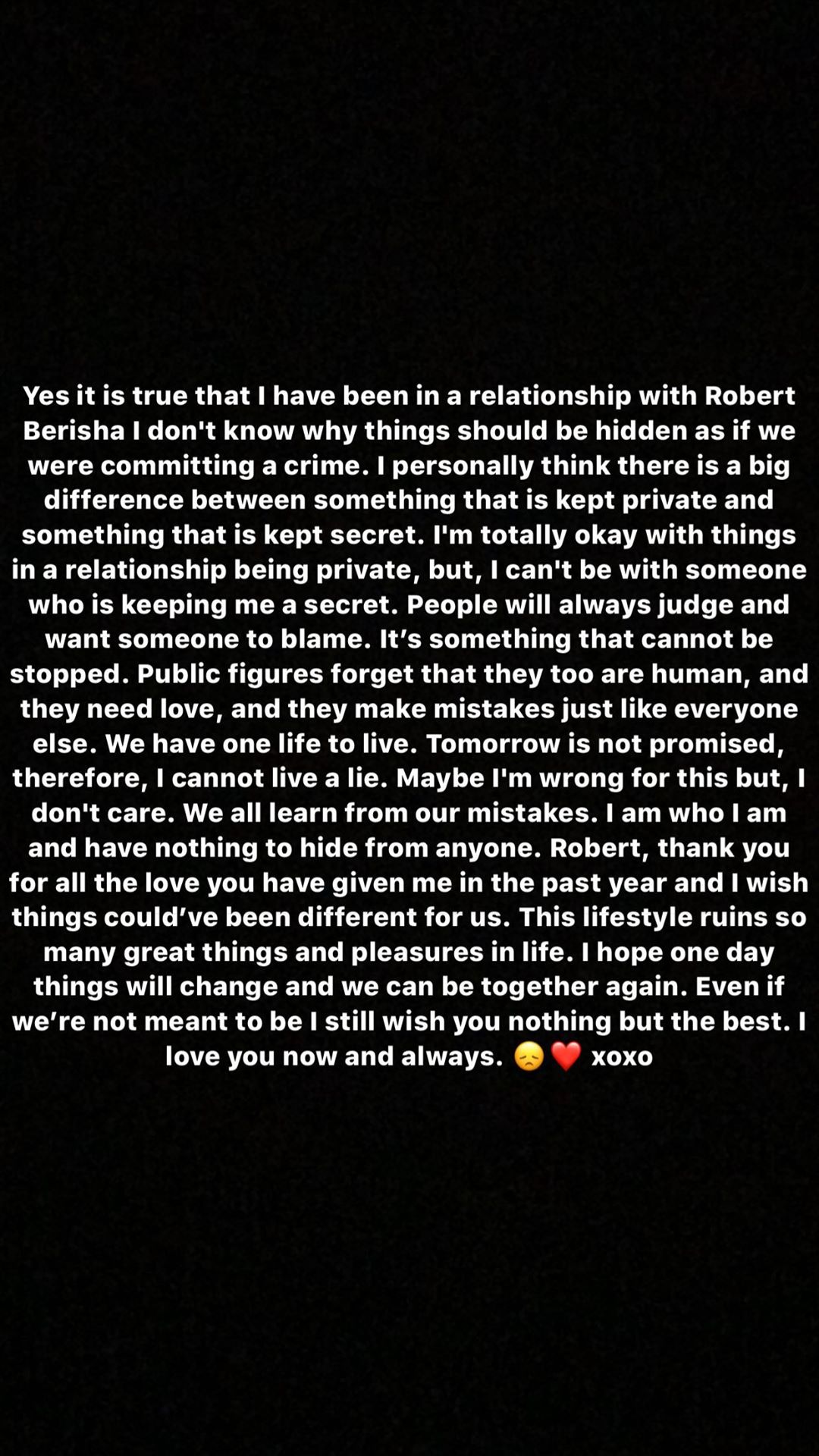 “Po, është e vërtetë që kam qenë në lidhje me Robert Berishëm. Nuk e kuptoj pse gjërat duhet fshehur thua se po bëjmë krim. Personalisht mendoj që ka një dallim të madh mes të mbajturit një gjë private dhe të mbajturit një gjë sekrete. Jam totalisht dakord që lidhjen të mbahet private, po nuk mund të qëndroj në lidhje me dikë që më mban sekret. Njerëzit gjithnjë do të paragjykojnë dhe të kërkojnë dikë për të fajësuar. Është diçka që nuk mund të ndalet. Fytyrat publike harrojnë që edhe ata janë njerëz, kanë nevojë për dashuri dhe bëjnë gabime si çdo kush tjetër. Ne kemi një jetë për të jetuar. E nesërmja nuk na premtohet, kështu që unë nuk mund të jetoj një gënjeshtër. Ndoshta jam gabim për këtë por nuk më bëhet vonë. Ne të gjithë mësojmë nga gabimet tona. Jam kjo që jam dhe nuk kam asgjë për të fshehur. Robert, të falënderoj shumë për gjithçka që me kë dhënë këtë vit që shkoi, dhe do doja që gjërat të ishin ndryshe për ne. Ky stil jete shkatërron shumë gjëra të mëdha dhe kënaqësi të jetës. Shpresoj që një ditë gjërat do të ndryshojnë dhe ne mund të jemi bashkë përsëri. Edhe nëse nuk do të jemi, përsëri dëshiroj më të mirën për ty. Të dua tani dhe përgjithmonë.”