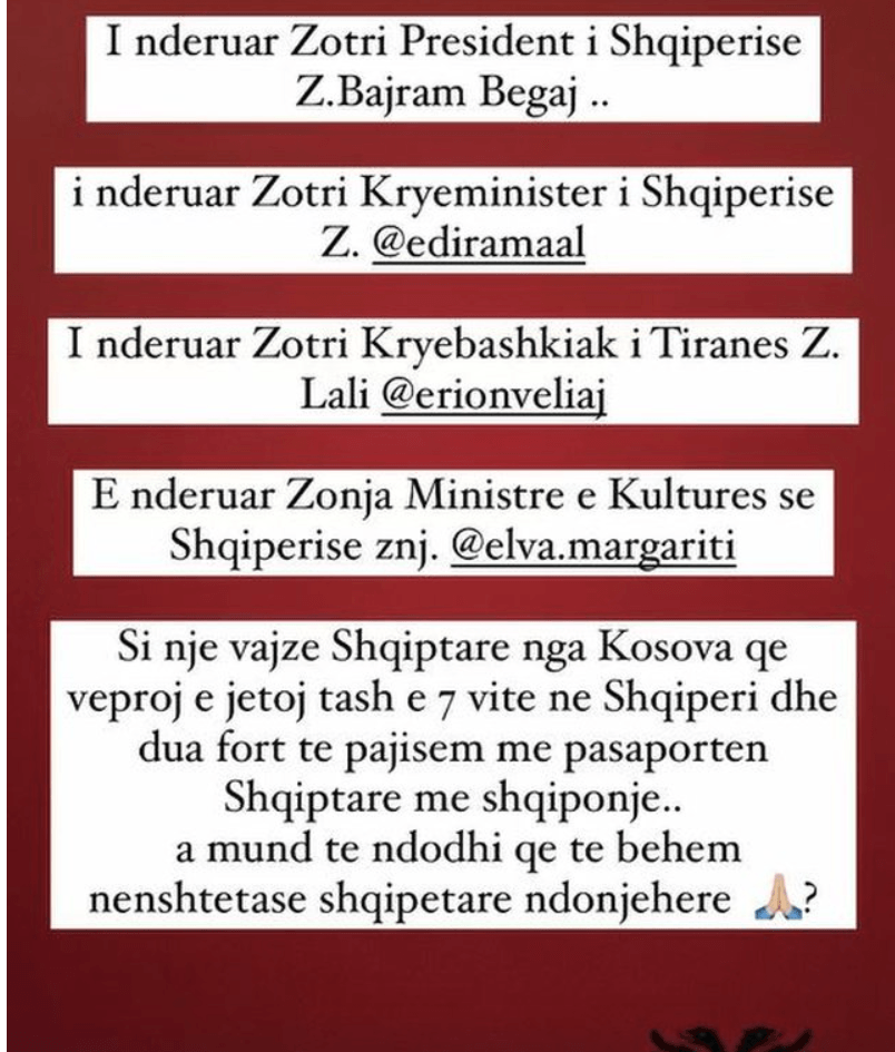 Kërkesen Fifi zgjodhi ta bënte në një postim në instagramin e saj personal ku i drejtohet kryeministrin Edi Rama, presidentit Bajram Begaj.