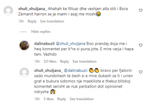 “Ke filluar dhe veshjen alla stili i Bora Zemanit, harron se je mami asaj me moshë”- shkruan ndjekësa, e cila nuk mbeti pa një përgjigje nga ana e Dalinës. “Boo prandaj doja me i heq komentet për k*re si puna jote. E mirë varja i hapa tani, vazhdo”– shkruan Dalina në përgjigjen e saj, në seksionin e komenteve.
