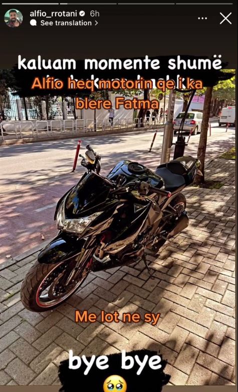 Mirëpo, së fundmi, ai ka bërë një tjetër veprim që vulos raportin me nënën e djalit të tij. Alfio ka publikuar një fotografi të një motori duke shkruar “Bye Bye”. Siç shihet nga fotoja, bëhet fjalë për motorin që i ka dhuruar Fatma disa vite më parë. Asokohe, Alfio shkroi: “S’kam faj unë që të thërras ‘drita e syve t’mi’ … Të dua”!