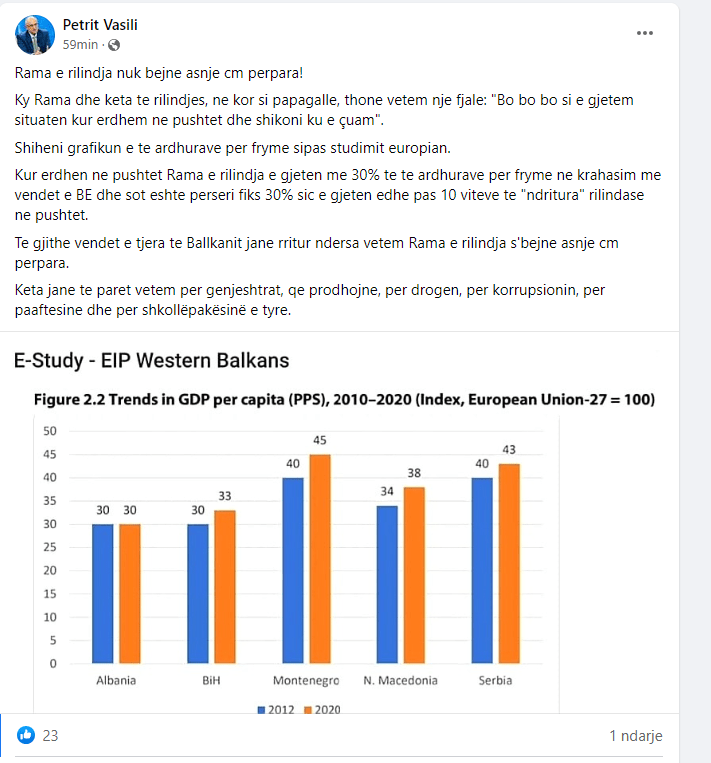 “Kur erdhën në pushtet Rama e rilindja e gjetën me 30% të ëardhurave për frymë në krahasim me vendet e BE dhe sot është përseri fiks 30% siç e gjetën edhe pas 10 viteve të “ndritura” rilindase në pushtet”, shkruan ndër të tjera ai.