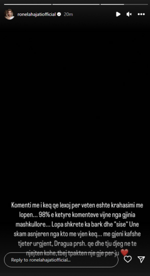 “Komenti më i keq që lexoj për veten është krahasimi me lopën… 98% e këtyre komenteve vijnë nga gjinia mashkullore… Lopa shkretë ka bark dhe “sisë”. Unë s’kam asnjërën nga këto më vjen keq… Më gjeni kafshë tjetër urgjent, Dragua përshembull, që dhe t’ju djeg në të njejtën kohë, të bëj të paktën një gjë për ju”- shkruan Ronela në Instastory.