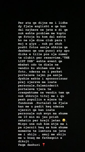 E Arta në reagimin e saj që ka bërë pak minuta më parë në Intagram, e mohon këtë gjë, duke thënë se fotoja e saj që e kanë publikuar agjensia është vetëm foto e realizuar në një event në atë klub.